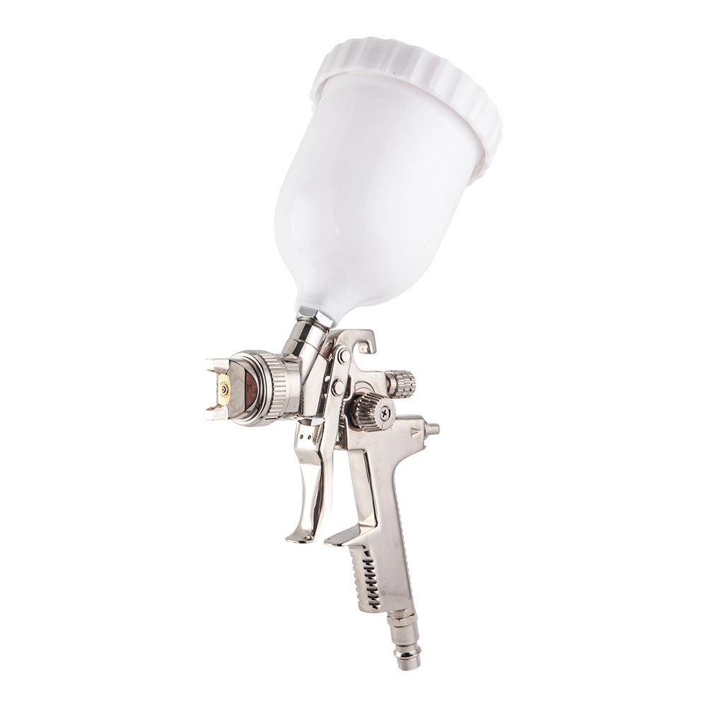Pistola de pintura prateada com copo branco