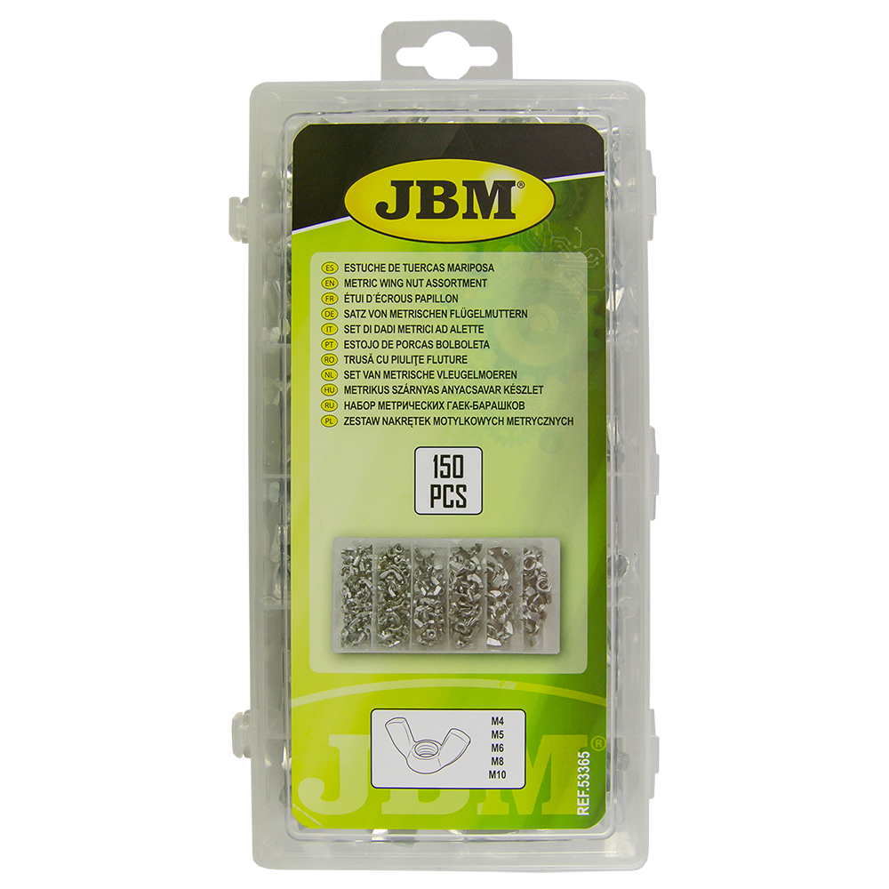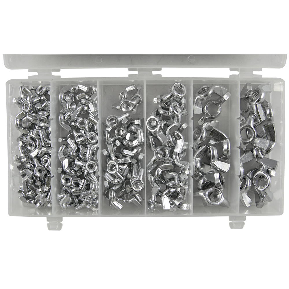 Caixa transparente com porcas borboleta metálicas organizadas por tamanhos de M4 a M12
