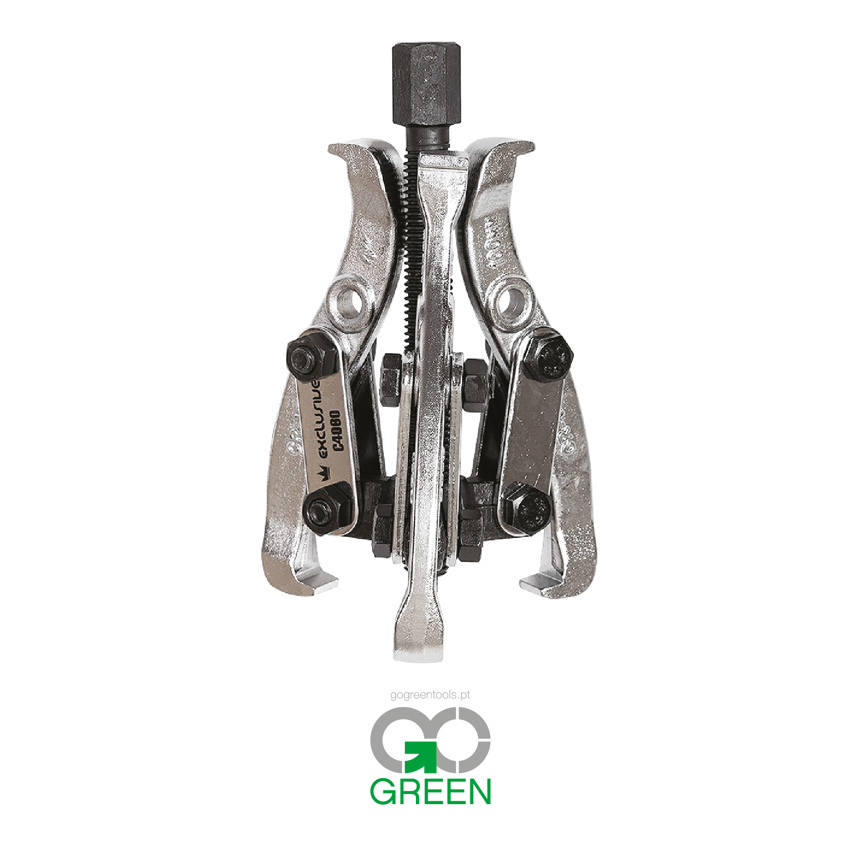 Extrator de rolamentos com três pernas- 100mm. As pernas são fabricadas em aço cromo-vanádio (CR-V). O crómio utilizado garante a resistência do aço à corrosão, à oxidação, à abrasão e uma elevada resistência a altas temperaturas, enquanto a adição de vanádio contribui igualmente para a sua resistência a altas temperaturas e para não se deformar. Roscas trapezoidais.
