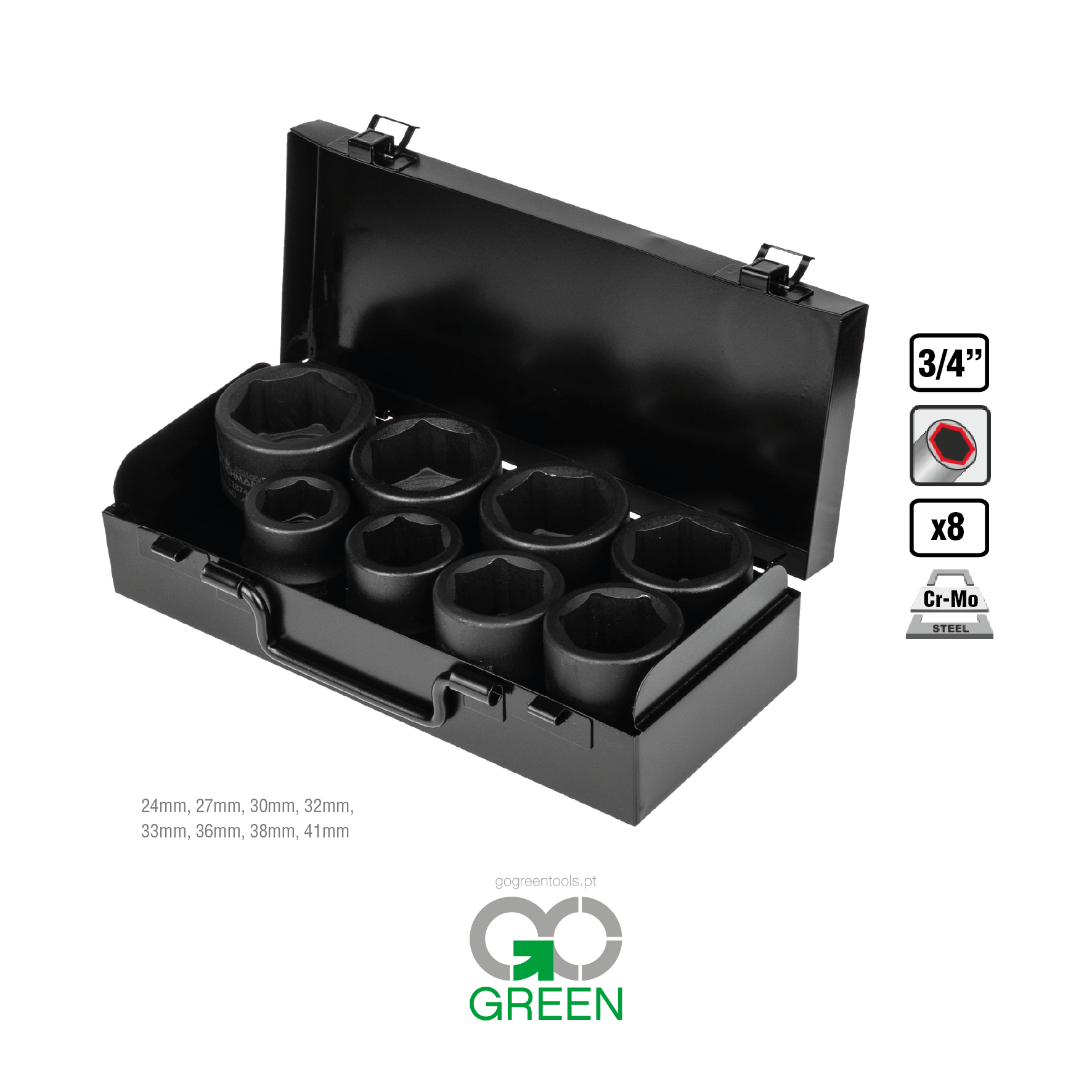 Conjunto de 8 peças de soquetes sextavados de ¾” em uma faixa de tamanho de 24-41 mm, colocados em um estojo de transporte de metal. Feito de aço cromo-molibdênio (Cr-Mo), que tem maior resistência ao impacto com baixo peso líquido, e a adição de molibdênio evita a deformação, aumentando a resistência geral do aço à corrosão em ambiente úmido e ácido. Estojo de transporte, alça e fechos feitos de metal de alta qualidade. Cada anexo do conjunto tem um espaço interno designado. Qualidade premium. Garantia vitalícia.