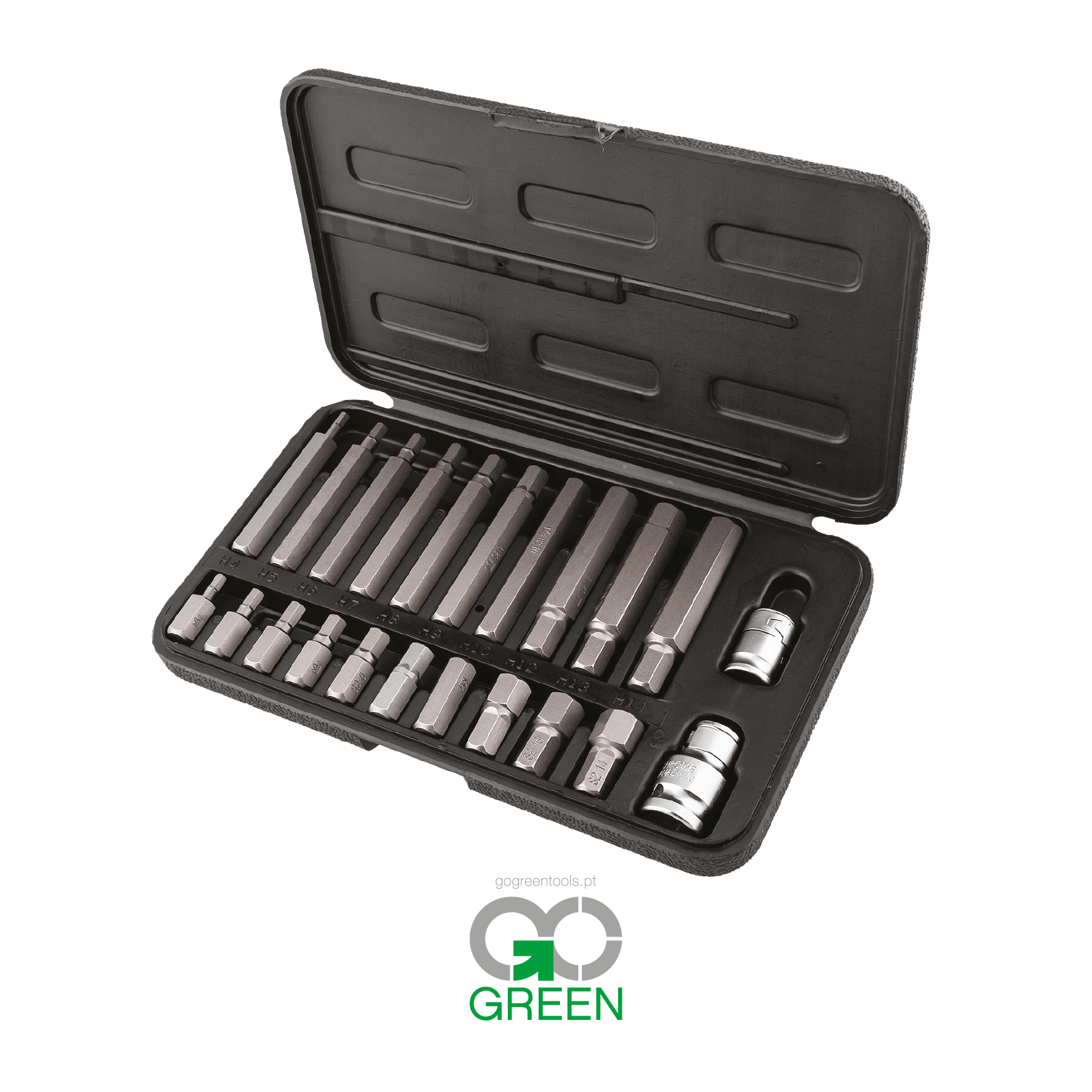 O conjunto inclui chaves Allen internas longas e um suporte para chave de catraca nos dois tamanhos mais populares.