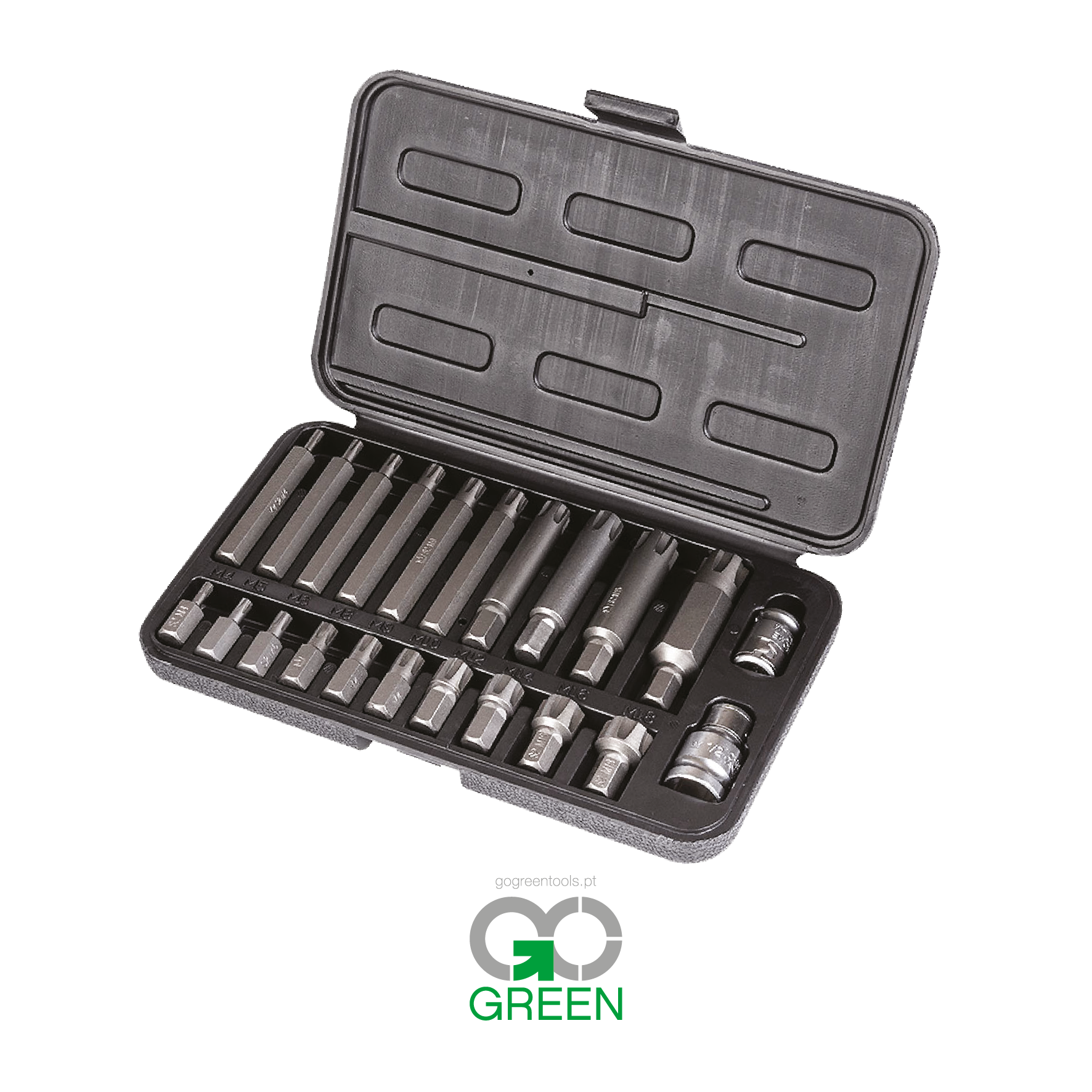 Um conjunto de 22 peças que inclui: brocas RIBE longas, brocas RIBE curtas, dois suportes de ½” e 3/8”.