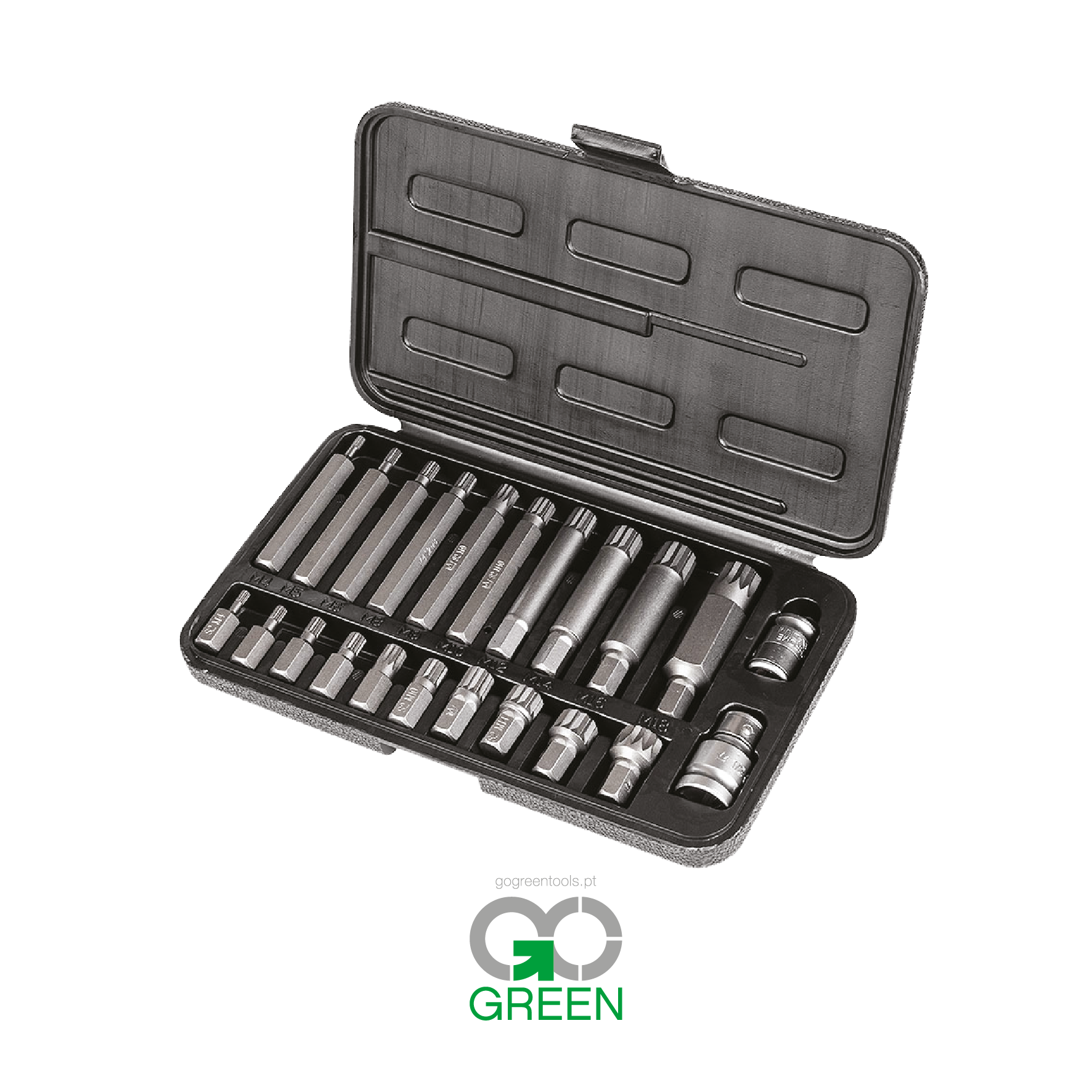 Um conjunto de 22 peças incluindo: brocas SPLINE longas, brocas SPLINE curtas, dois suportes de ½” e 3/8”.