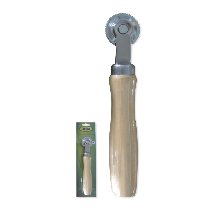 Ferramenta com cabo de madeira e roda dentada em embalagem verde
