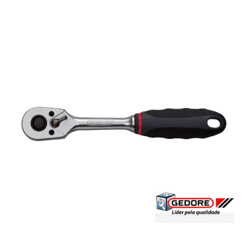Chave de catraca com pega preta e detalhes vermelhos, com logo GEDORE e texto promocional.