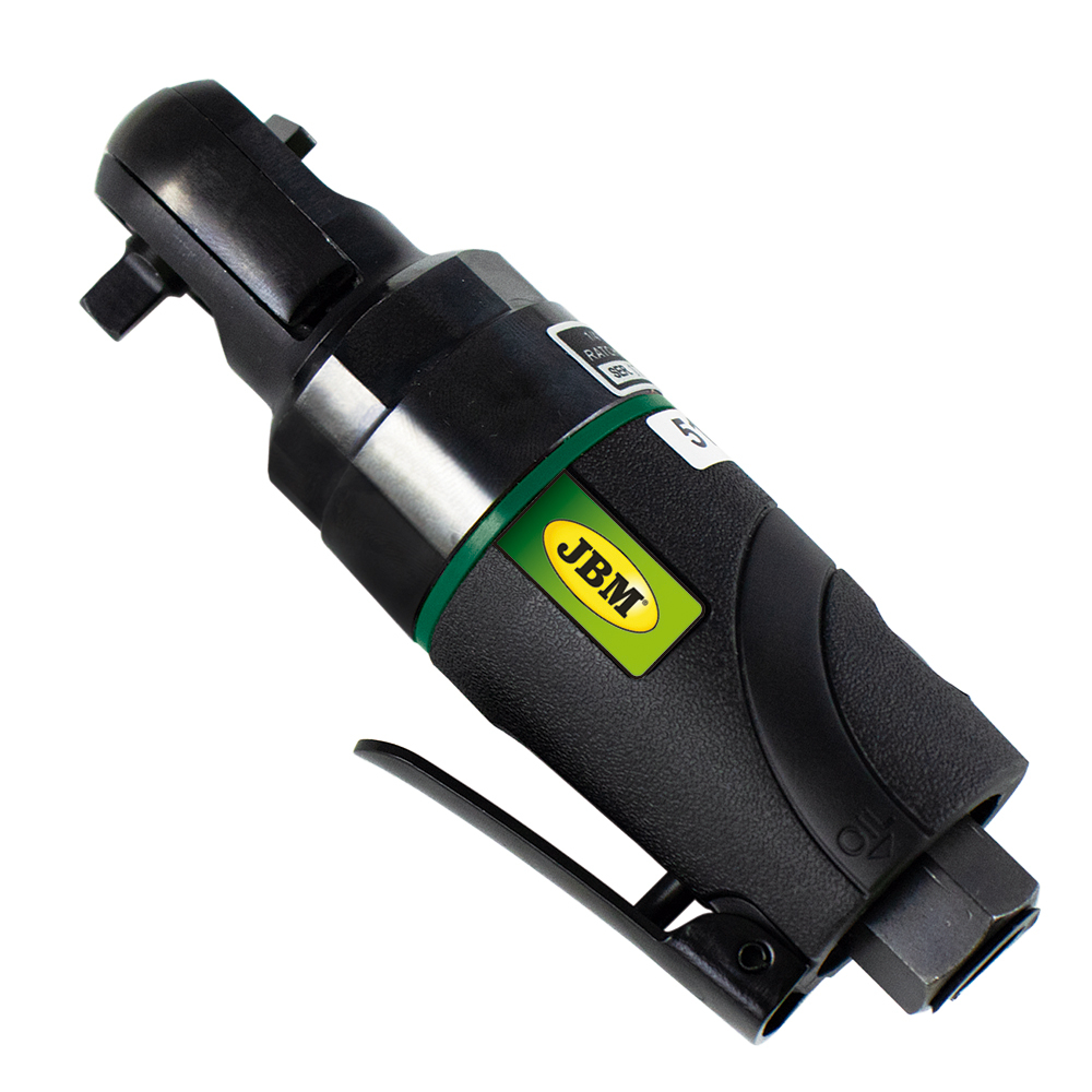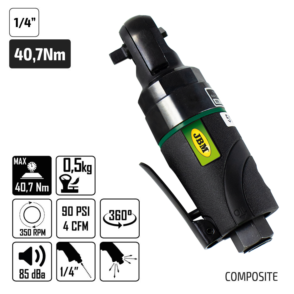 Ferramenta pneumática preta JBM com especificações técnicas em fundo branco