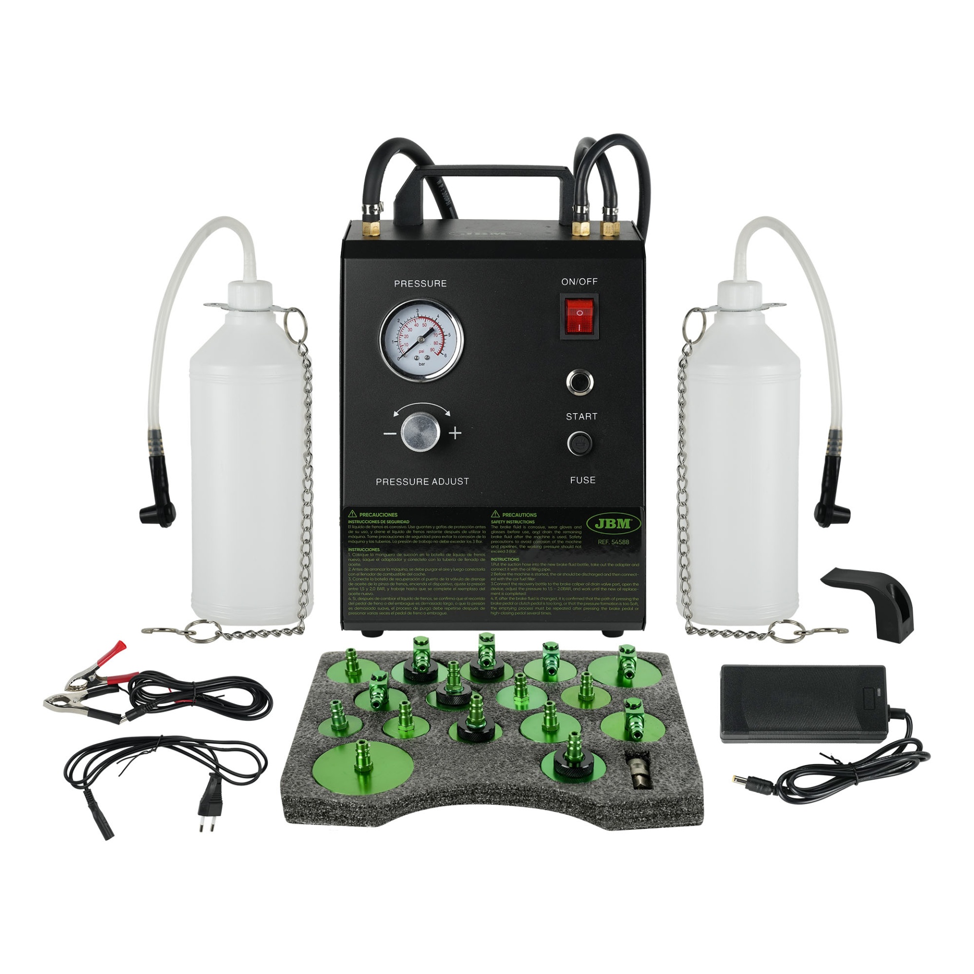 Este sangrador de freios utiliza um sistema elétrico para gerar pressão e extrair o ar preso no sistema de freios. Este kit contém vários adaptadores e é universal.