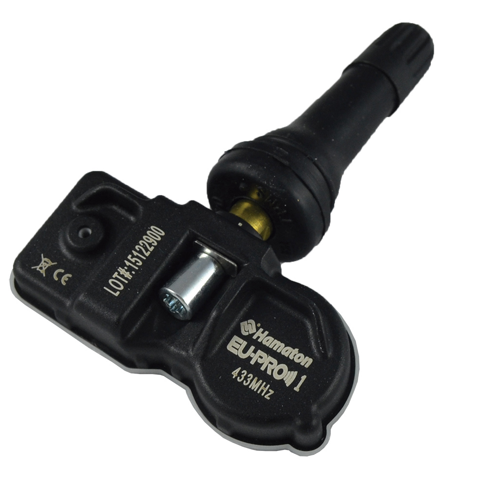 Sensor de pressão dos pneus Hamatron EUPRO-II preto com etiqueta e fundo branco