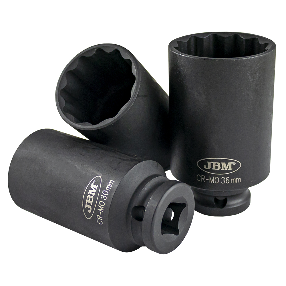 Conjunto de três soquetes JBM em caixa plástica preta, tamanhos 27mm, 30mm e 32mm