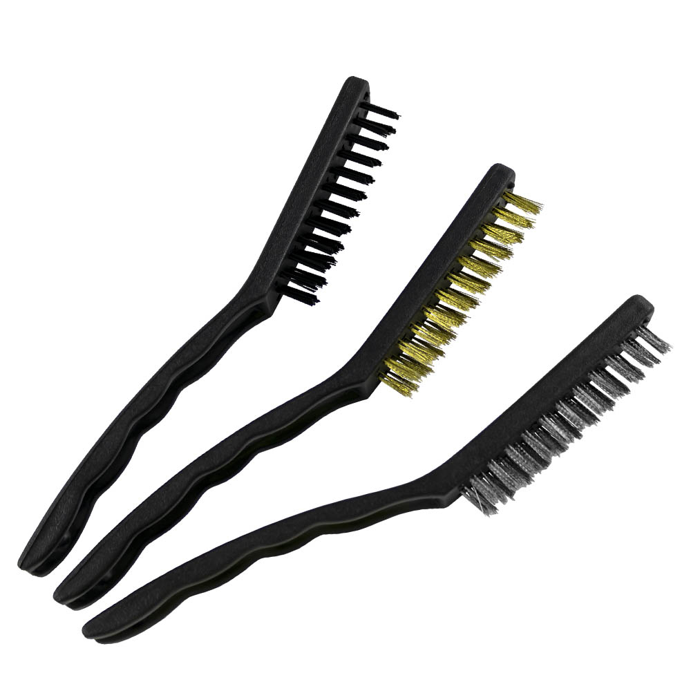 Três escovas de limpeza com cabo preto e cerdas pretas, douradas e prateadas