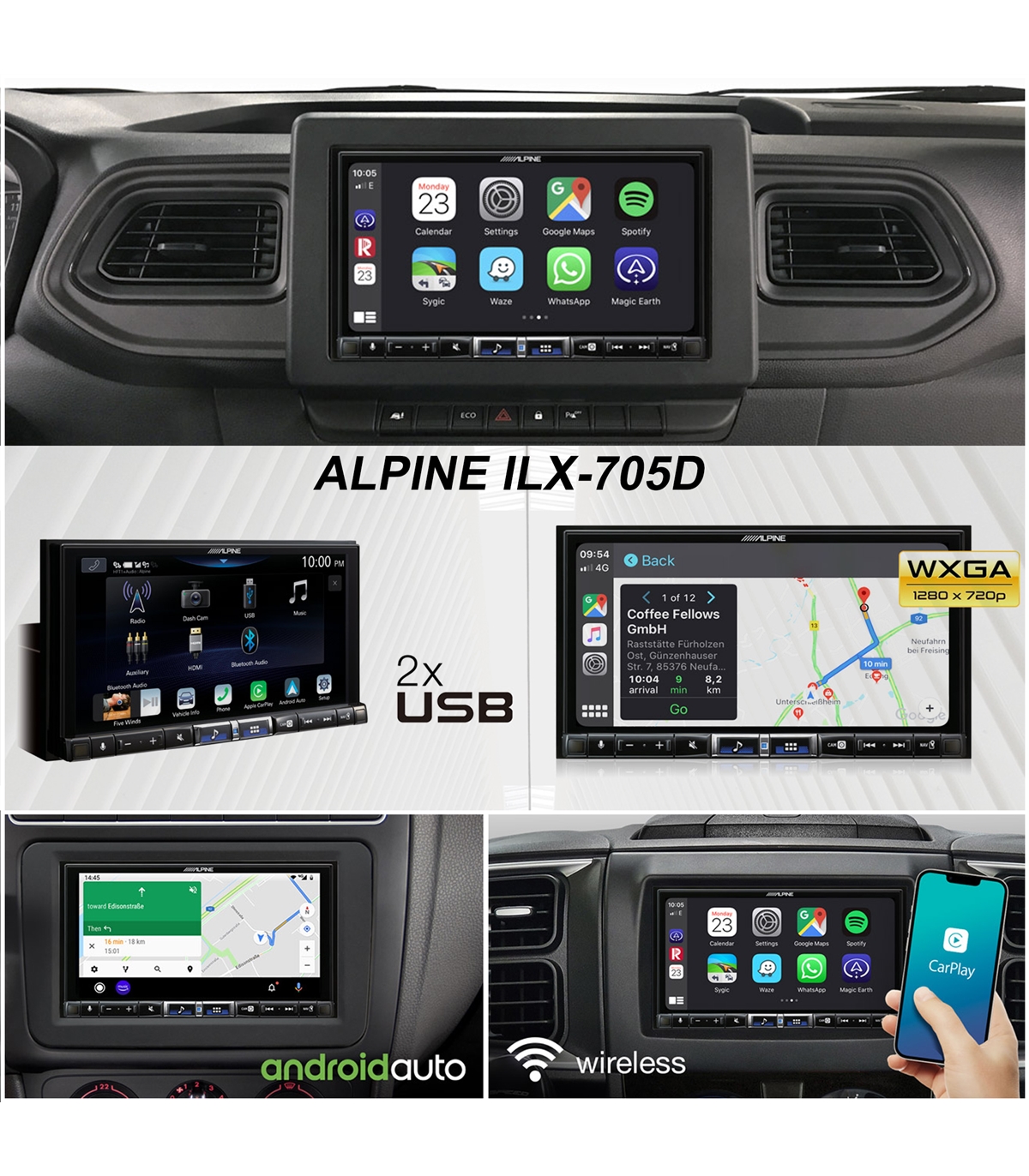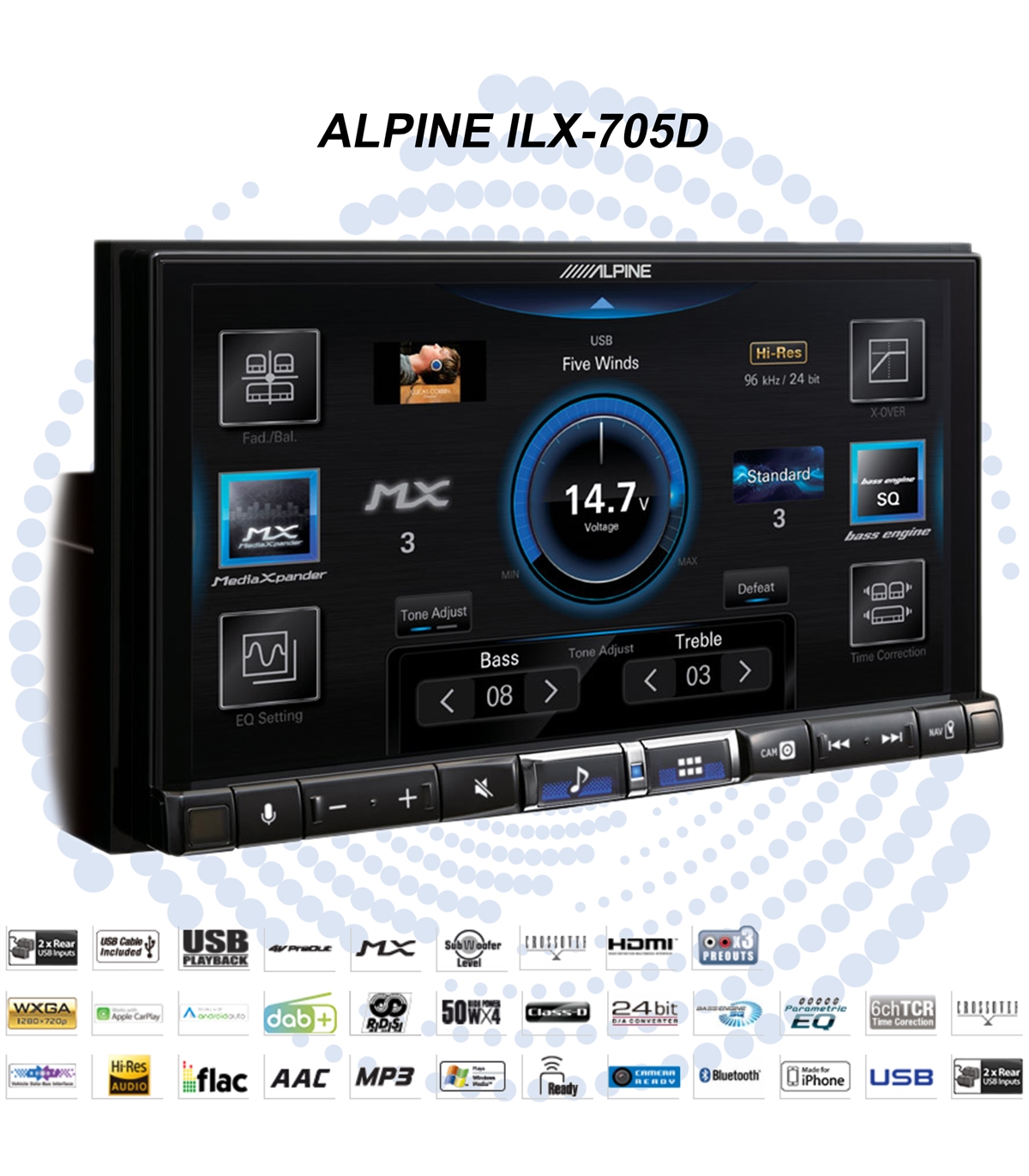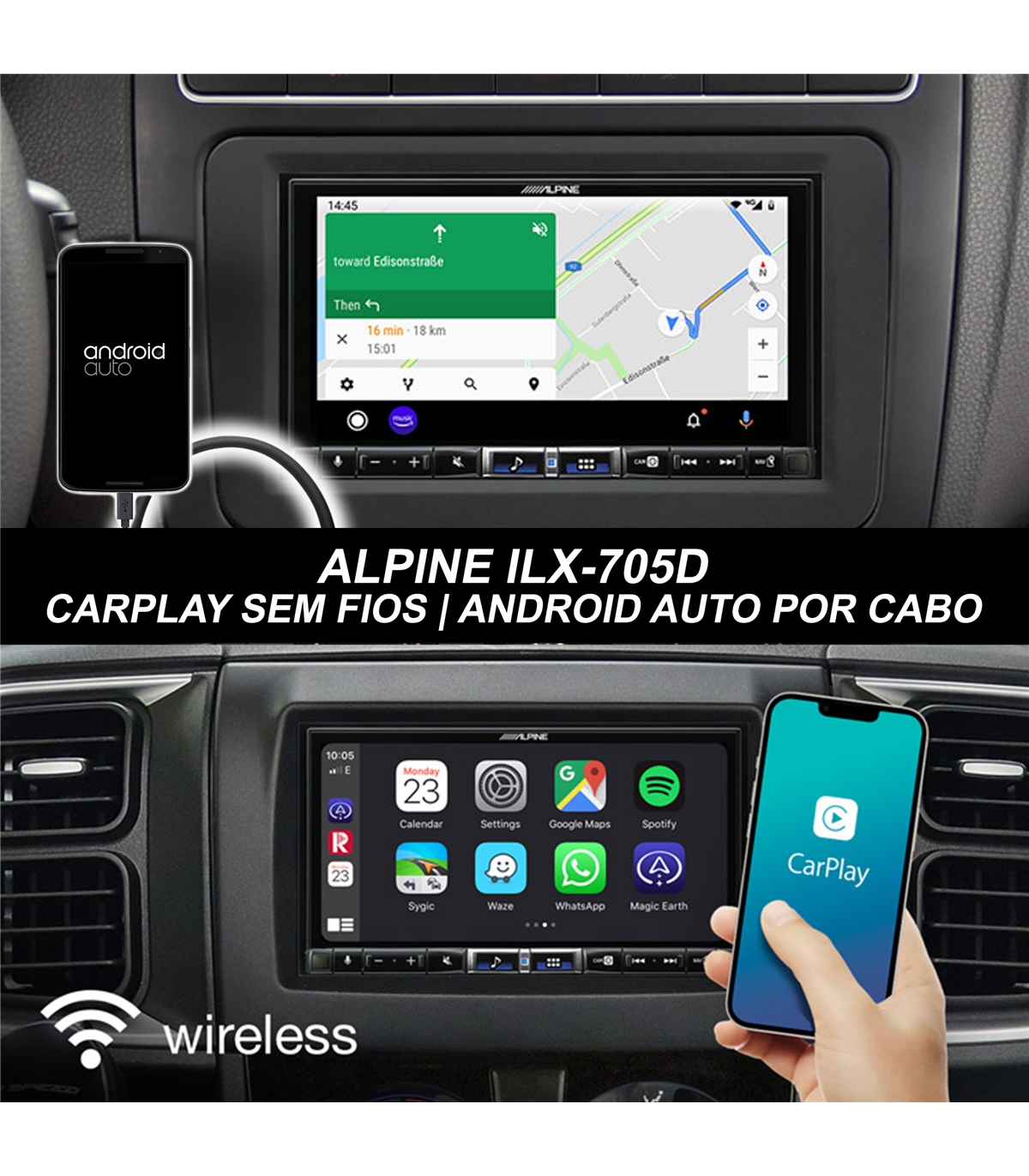 O iLX-705D é o sucessor da premiada e popular estação multimédia digital iLX-702D. Esta nova geração inclui muitas melhorias, como uma resolução de ecrã muito mais alta, Apple CarPlay sem fios, 2 portas USB, bem como um amplificador de classe D incorporado e capacidades de Áudio Hi-Res. Se procura um sistema 2DIN de alto desempenho para o seu carro que inclua todas as funcionalidades mais recentes, compatibilidade com meios de comunicação de última geração e incrível qualidade de som, o iLX-705D é para si. Desfrute de compatibilidade wireless Apple CarPlay e Android Auto (com fios), rádio digital DAB+, reprodução de vídeo USB, reprodução de áudio de alta qualidade, transmissão de áudio e Bluetooth mãos-livres, e muito mais com esta incrível unidade principal. Adquire boa qualidade de som para o seu veículo: O Alpine iLX-705D está entre as primeiras unidades principais do mundo a contar com um amplificador de classe D incorporado e tem uma vasta gama de funcionalidades profissionais de afinação de som, como x-overs digitais, um paramétrico EQ, correção de tempo digital e muito mais