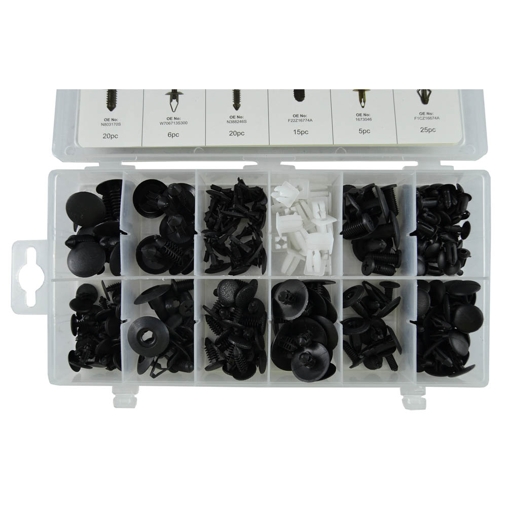 Caixa plástica com rebites e presilhas de fixação pretos e brancos em várias divisórias