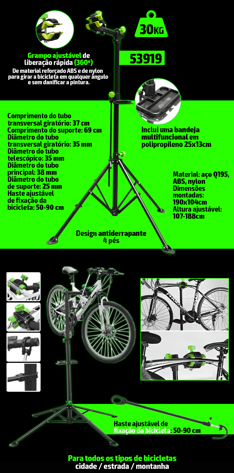 Pinça ajustável de liberação rápida 360º feita de material ABS reforçado e nylon para virar a bicicleta em qualquer ângulo e não danificar a pintura. Com bandeja de ferramentas multifuncional feita de PP 4 pés com design antiderrapante