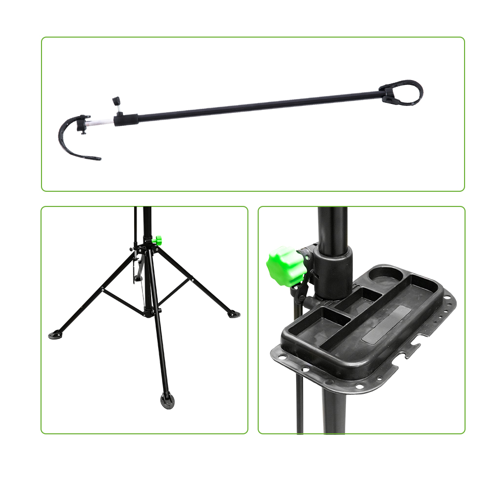 Material: Aço Q195, ABS, nylon Dimensões montadas: 190x104cm Altura ajustável 107-188cm tubo transversal de rotação: 37 cm comprimento pernas: 69 cm Diâmetro do tubo transversal rotativo Tubo telescópico de 35mm de diâmetro: 35mm Diâmetro do tubo principal: tubo de 38mm de diâmetro pernas: 25mm fixação da barra ajustável: 50-90cm Dimensões ferramentas da bandeja multiuso: 25x13cm carga máxima Peso: 30 kg Peso: 7 kg Aplicação: City / road / mountain bike