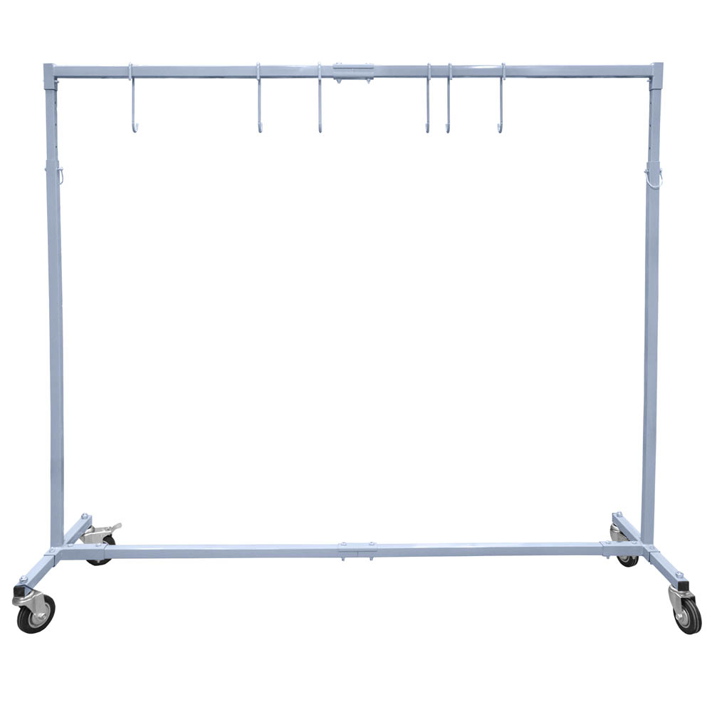 Estrutura metálica branca com rodas e ganchos para pendurar objetos