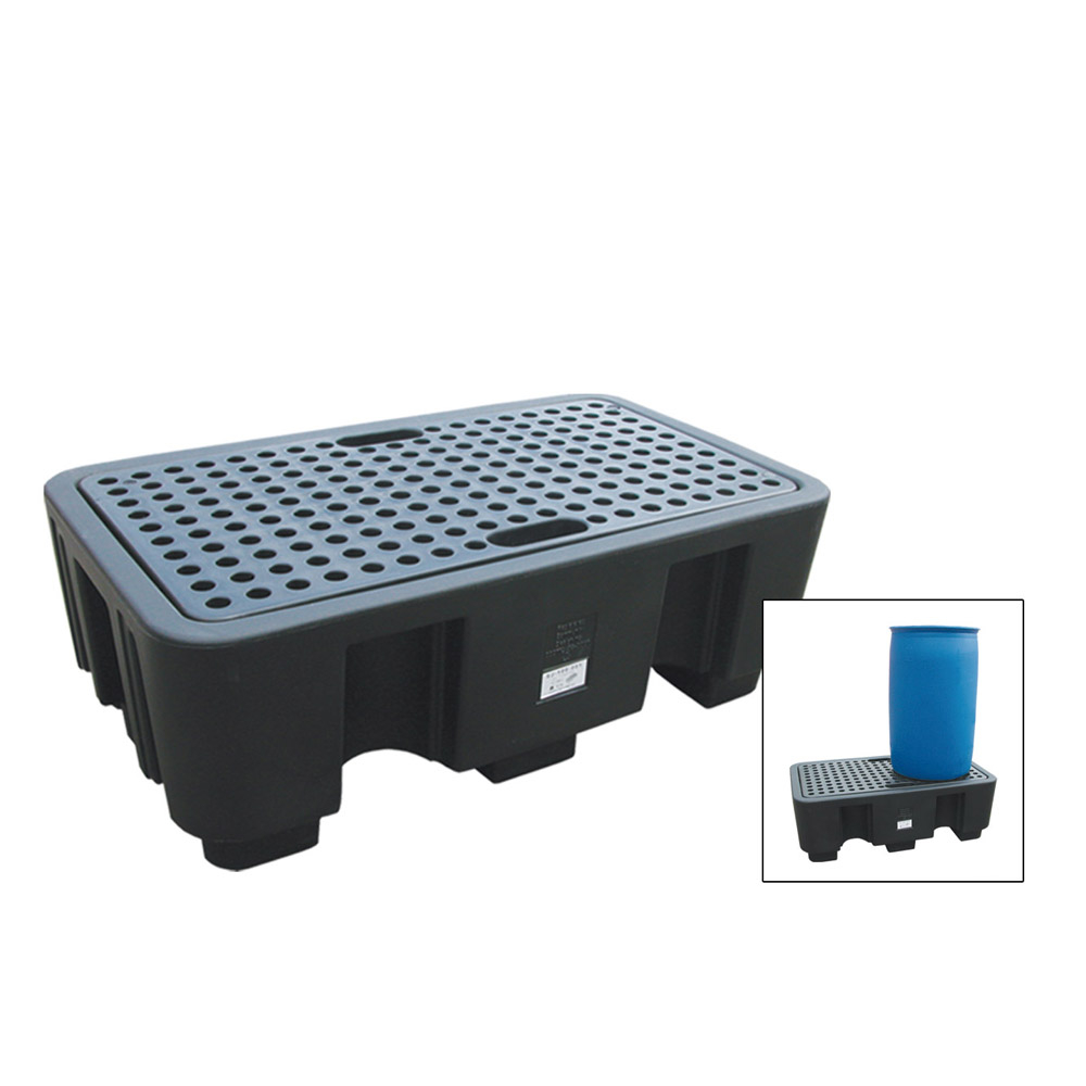 - Palete de derrame para 2 tambores - Tampa removível - Palete de derrame fixo - Remova os tambores antes de usar uma empilhadeira - Fácil transporte. Para uso com a maioria das empilhadeiras e porta-paletes - Feito de polietileno (PE) 100% reciclável