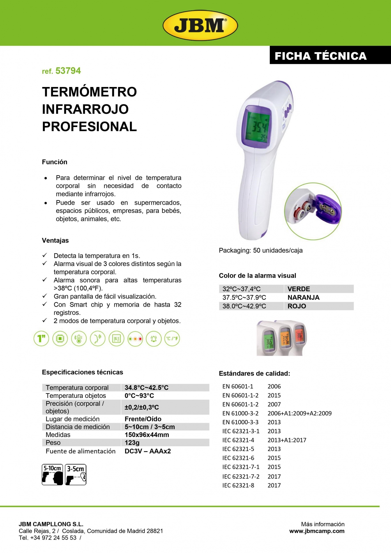 Unidades de medição frontal : Celsius (ºC) e Fahrenheit (ºF) Condições ambientais de trabalho: 16 ° C-35 ° C (60,8 ° F a 95 ° F) com uma umidade relativa de 15% - 80% Condições ambientais de armazenamento: -20 ° C - + 55 ° C (-4 ° F a 131 ° F) com umidade relativa de 15% - 93% Distância de medição: 15 mm - 50 mm Faixa e precisão da medição de temperatura testa: Faixa de medição: 32,0 ° C- 42,2 ° C (89,6 ° F - 108 ° F) Precisão da medição: ± 0,2 ° C (35 ° C - 42 ° C) / ± 0,4 ° F (95 ° F - 107,6 ° F); ± 0,3 ° C (± 0,5 ° F) outra faixa Memória de medição: 32 lembretes de medição Dimensões: 144x101x36mm Peso: 81g (sem baterias) Bateria: 2 baterias AAA (DC 3V) (não incluídas) Desligamento: desligamento automático após 1 minuto