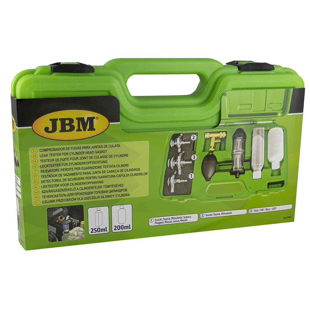 O JBM 53662 é a ferramenta definitiva para diagnosticar danos na junta da cabeça de cilindros sem precisar de desmontar o motor. Através de um fluido reativo que muda de cor na presença de gases de combustão no radiador ou vaso de expansão, este kit oferece uma prova incontestável ao mecânico e ao cliente sobre o estado do motor.