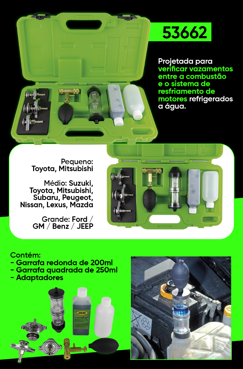 Este é um equipamento de diagnóstico essencial para evitar erros caros na oficina. O JBM 53662 permite detetar se há CO_2 no sistema de refrigeração, confirmando de forma rápida e visual se a junta da culatra (cabeça de cilindros) está queimada ou se existe alguma fissura no bloco/cabeça.