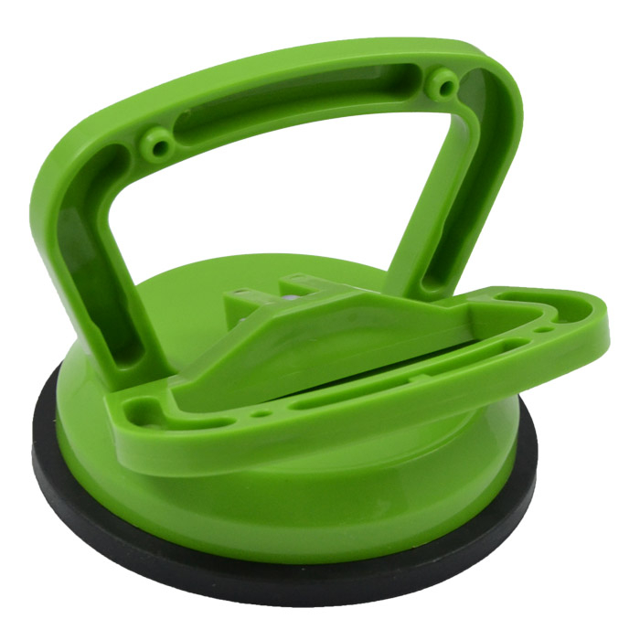 Ventosa de plástico verde com pegador articulado e base preta em borracha.